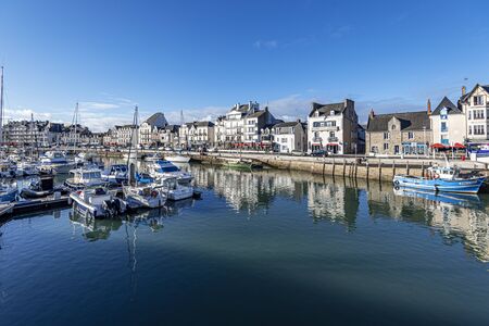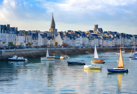 Variety of yachts and boats moored in harbour of port city of Saint-Malo, Brittany, France