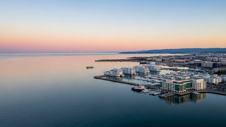 An aerial perspective of a modern marina bathed in the soft light of sunrise. Pristine white buildings with contemporary architectural line the waterfront, interspersed with numerous yachts and boats docked in the calm, reflective water. The sky transitions from soft pink to a pale blue, creating a serene and tranquil atmosphere. The scene captures a sense of organized urban development meeting the peaceful expanse of the sea.