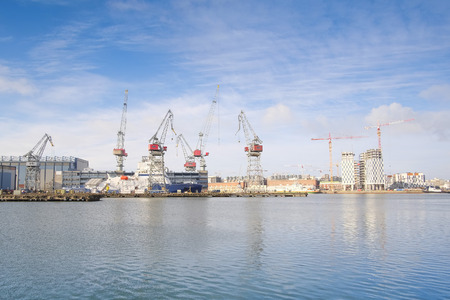 West Harbour skyline, Malmo, Sweden. Clear blue sky and a calm blue ocean
