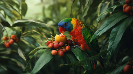 Rainbow Lorikeet parrot sitting on a branch with fruits