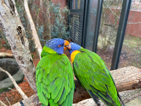 Two Lori parrots kiss at the Zurich Zoo in Switzerland after feeding