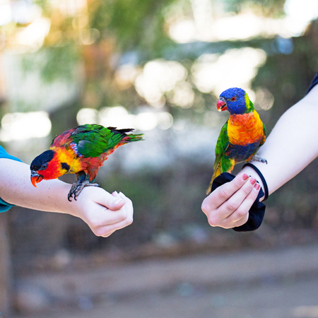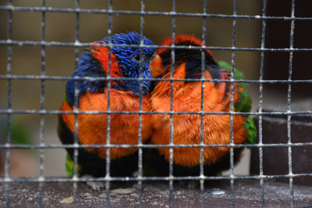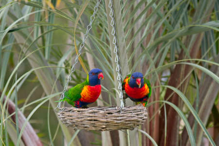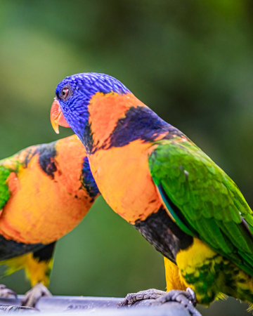 Beautiful Rainbow Lorikeet birds, perched on the metal handrail