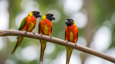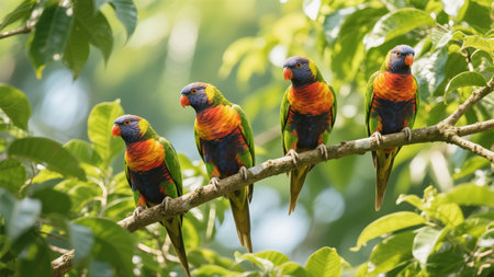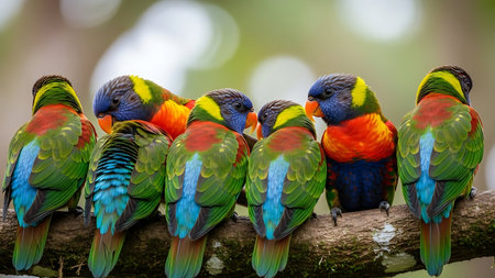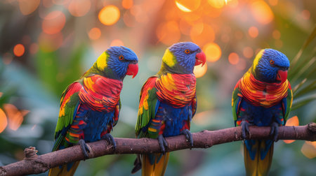 Vibrant rainbow lorikeets share an intimate moment on a sun-drenched branch, symbolizing love and nature's beauty.
