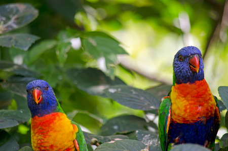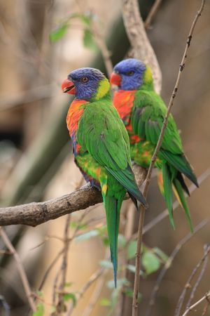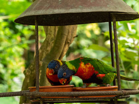 Couple of beautiful colorful parrots sitting together on tree branch. Exotic wild animal at the zoo.