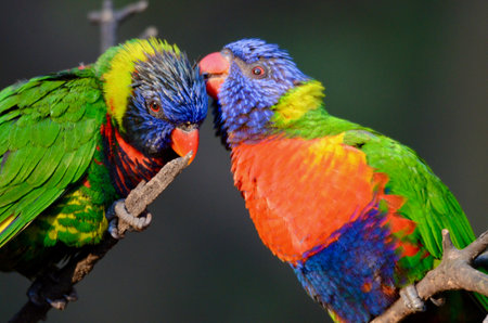 Two colorful rainbow lorikeets perched on a branch are nuzzling each other, showcasing their vibrant plumage