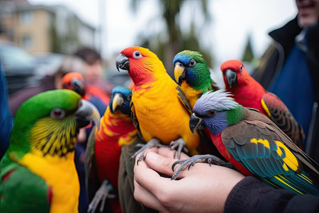 Two vibrant parrots are showcased in a close-up shot, their plumage a mix of blue, red, and green. The composition emphasizes the birds' detailed features, including their beaks and eyes. The lighting suggests a natural, outdoor setting, making it suitable for editorial or commercial projects.