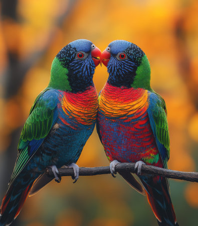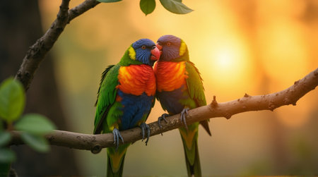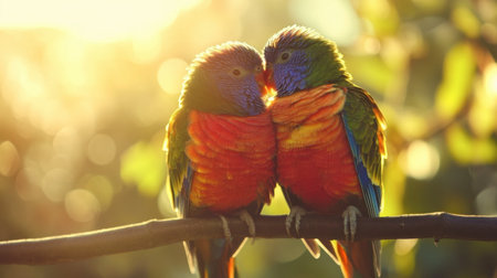 Two colorful birds share a tender moment perched on a branch, bathed in warm sunlight. Their vibrant feathers and loving pose create a serene nature scene.