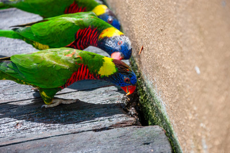 curious colorful trichoglossus or lorikeets are looking for something under deck
