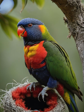 An AI generated illustration of a vibrant and colorful Lorikeet perched atop a nest