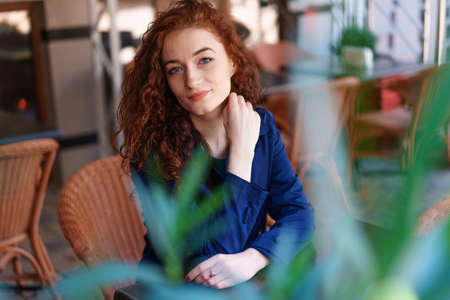 Beautiful young stylish ginger woman with freckles. Fashion portrait of charming girl wearing casual clothes posing at home. Passion