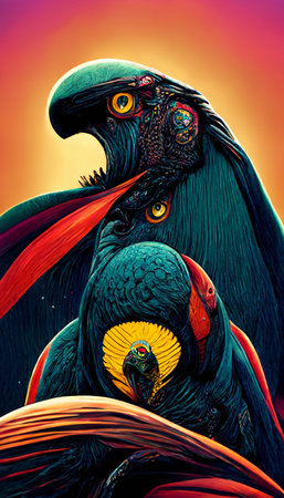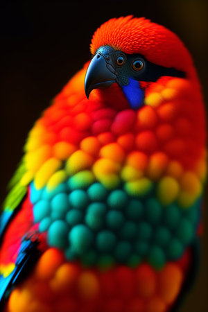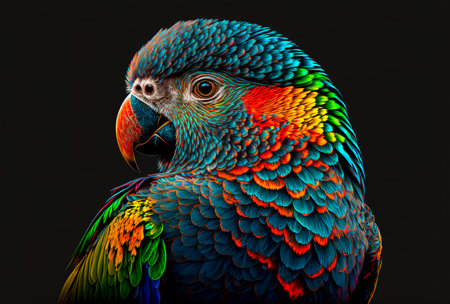 Beautiful colorful parrot isolated on black background. Close up. Generative AI