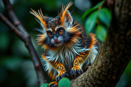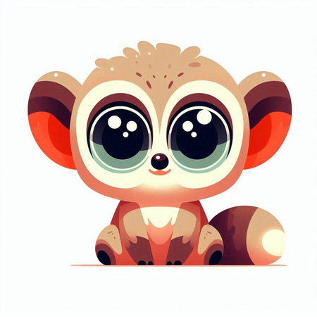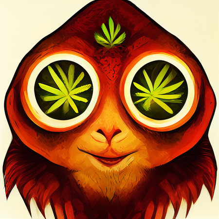 Funny muzzle tarsier. Cannabis leaves in the eyes. Cartoon tarsier monkey. AI-generated