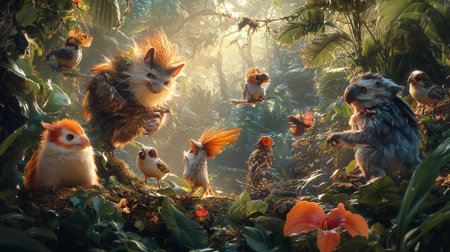 A fantasy portrait of an unusual bird in a fairy-tale elfin forest. Fabulous flower garden and cute fantasy birds. Concept of a colorful magic bird. Perfect for phone wallpaper or for posters.