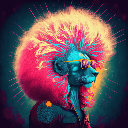 Party lion in sunglasses with mohawk hairstyle. Pop art style in neon colors. Generative AI. Not based on any actual scene