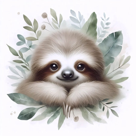 The muzzle of a sloth. Cute sloth on blue background portrait. Digital illustration.