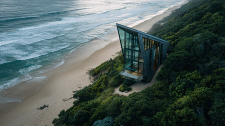 A house stands on the edge of the beach, with waves crashing and trees surrounding it. The setting shows nature and architecture together.