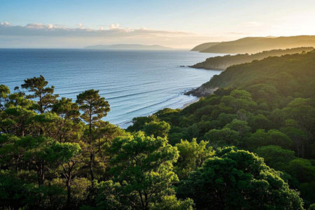 The tranquil light of the coastal forest, a natural picture of the sea and the sky