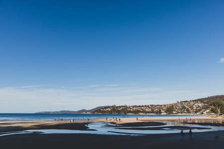 HOBART, AUSTRALIA - May 31st, 2020: view of Kingston Beach on a beautiful winter day, the area is a popular suburb south of Hobart the capital city of Tasmania