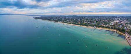 Aerial panorama of Sorrento suburb coastline with moored boats and beautiful turquoise water. Mornington Peninsula, Melbourne, Australia