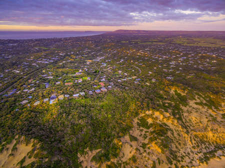 Aerial view of Mornington Peninsula suburban areas near Rye at sunset. Melbourne Australia