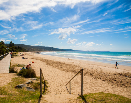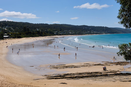 Low tide on the crescent-shaped sandy beach - Lorne, Victoria, Australia