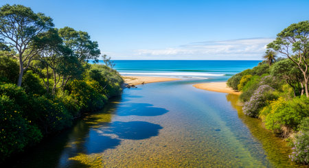 A beautiful and serene landscape where a clear, shallow river meanders through lush green trees and bushes to meet the turquoise ocean at a sandy beach. The clear blue sky and calm water create a peaceful and idyllic coastal scene. This is a perfect image for travel, nature, and relaxation themes.
