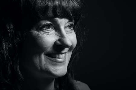 Studio black and white portrait of beautiful cool edgy middle aged white caucasian brunette woman. Aged European model with dark short hair looking away.