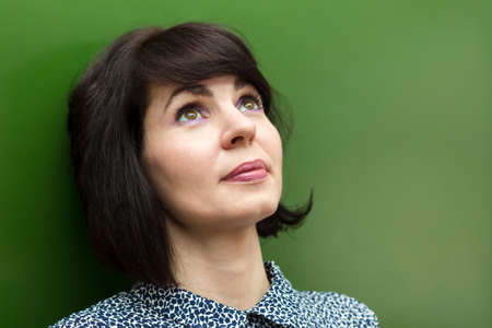 Closeup portrait of beautiful middle age white caucasian brunette woman with green eyes in coat jacket on fall autumn day outside looking in camera on yellow rye background