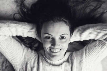 young sexy woman or girl with long brunette curly hair on pretty smiling face in autumn seasonal forest or wood sunny outdoor on natural background, black and white