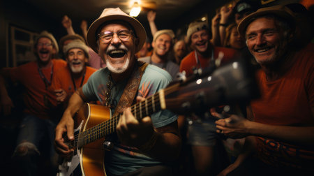 A man plays an acoustic guitar in a dark room. Live performance, acoustic concert.