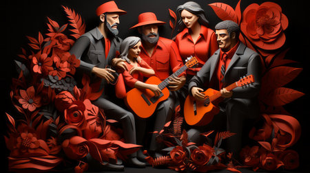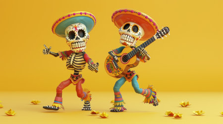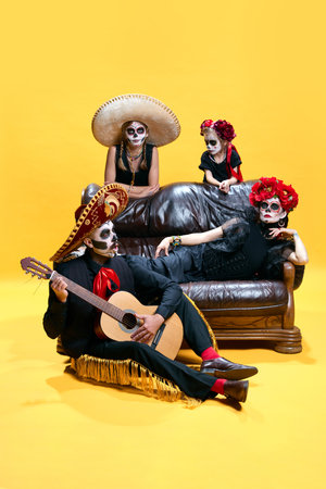 Halloween Family. Father playing on guitar, mother and children in halloween mexico makeup. Relaxing against yellow background. Concept of autumn, holidays, traditions, spooky. Ad.