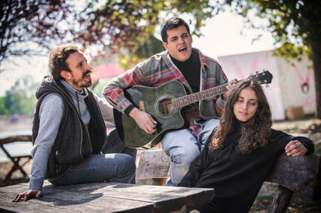 Positive and relaxed young friends play guitar and singing together while sitting on park bench and enjoy in beautiful romantic summer day