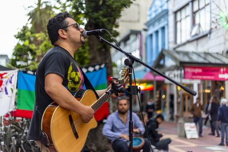 Wellington, New Zealand - November 23, 2018: Carlos Espinoza singing on Wellington's Chilean community protest against the killing of Mapuche man Camilo Catrillanca, shot by police in Chile.
