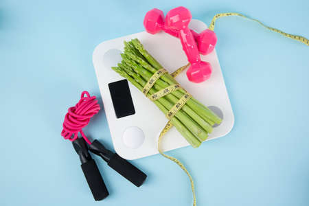 Woman measures her weight by standing her feet in socks on scale on a blue background with skipping rope and dumbbells. Flat lay composition. Healthy active lifestyle