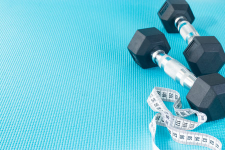weightloss and exercise concet, fitness dumbbell set on yoga mat with measuring tape wrapped around them