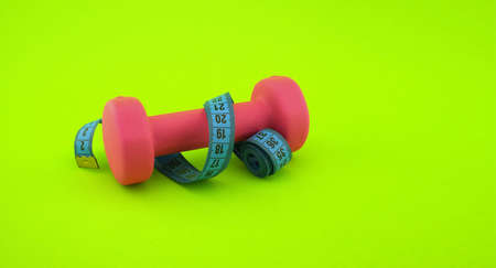 Still life with small dumbbells and measuring tape, as a concept of healthy nutrition and sports diet in close-up on green background