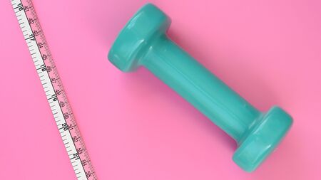 healthy lifestyle fitness weight control concept. Closeup pink dumbbell with measuring tape on white scales