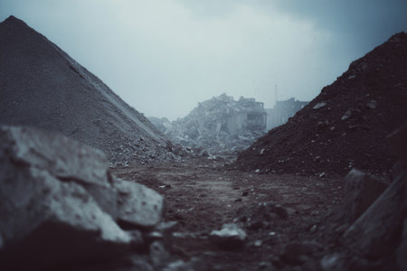 Construction disaster scene with cracked concrete blocks and dusty surroundings
