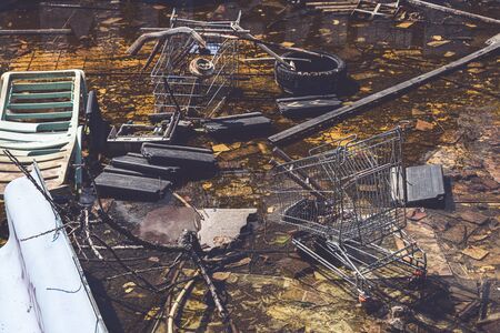 Remains of destroyed industrial building with internal communications. Demolition of building on territory plant. Background with dilapidated building and fragments of bricks and construction debris