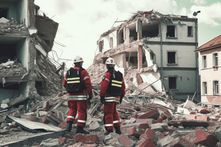 Rescuer in uniform searching for survivor in city building ruin from earthquake. distinct generative AI image.