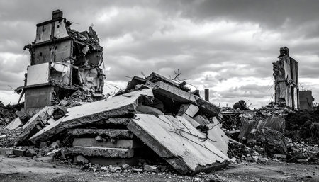 Decay showing rubble and destroyed buildings with dry grass in the foreground under a cloudy sky keywords: rubble,...