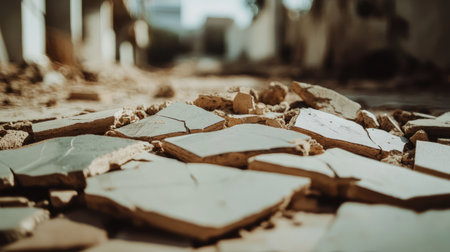 Close-up of shattered tile pieces in a construction line, showing rough textures and demolition impact