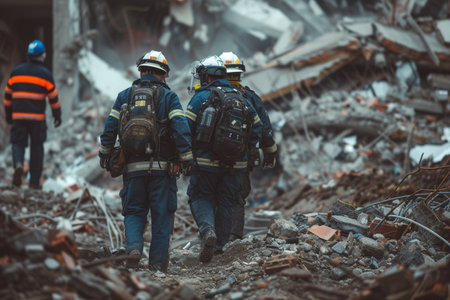 Rescue workers in hard hats and shovels searching through rubble and dust after an earthquake, illustrating the dangers and devastation of natural disasters