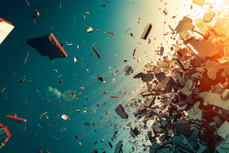 A striking image capturing the dynamic moment of bricks exploding into a cloud of dust and debris, creating a dramatic scene filled with energy and chaos.