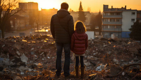 Dismayed woman and child silently witnessing the citys destruction caused by a powerful earthquake