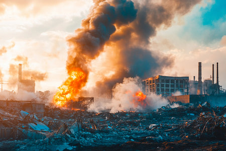 Flames rage amidst the ruins of an industrial area as smoke billows into the sunset sky. This fierce blaze highlights the destruction left behind. Emergency services respond to the disaster rapidly.