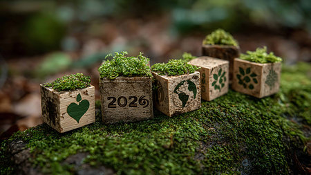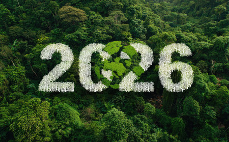An image displays the year 2026 integrated with a recycling symbol, set against a backdrop of lush, green trees. The composition evokes a sense of environmental sustainability and future focus. Ideal for illustrative uses related to ecological themes, conservation, and future planning, this could be utilized in various media.