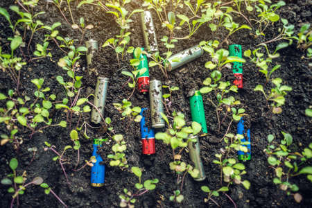 Used alkaline batteries lie in the soil where plants grow. The concept of environmental pollution with toxic household waste
