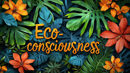 Colorful 'Eco-consciousness' lettering surrounded by lush, vibrant tropical leaves and flowers. The image promotes sustainability, nature, and eco-friendly concepts through its bright and lively design.