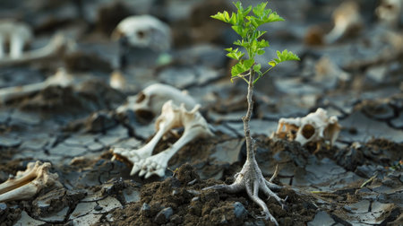 A strong young tree growing in dry, cracked soil with animal bones scattered around, symbolizing resilience and survival.